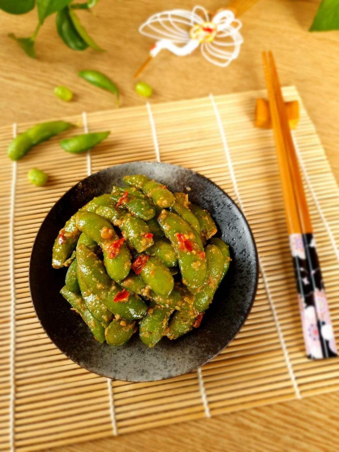 4. 從火上移開,將辛辣的味噌醬汁倒在毛豆上,攪拌均勻。