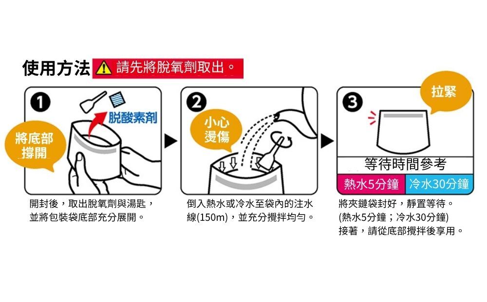 3. 等待(熱水5分鐘/水30分鐘)後再次攪拌,即可享用。