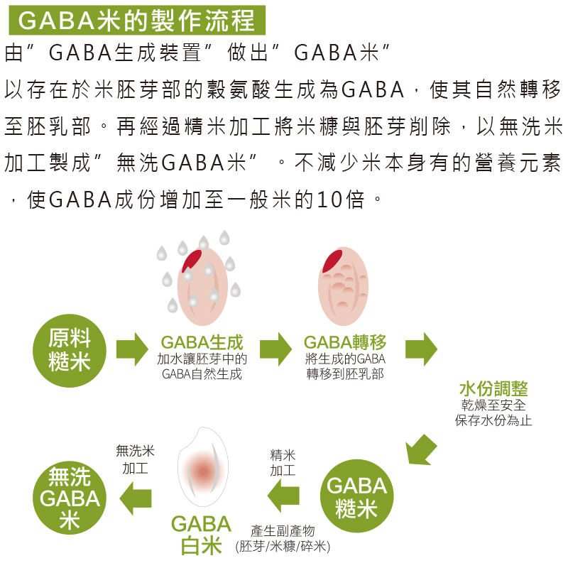 *GABA小知識: 正式名稱為γ- 胺基丁酸( γ- a m i n o b u t y r i c a c i d ),是普遍存在於人體的天然胺基酸衍生物,是中樞神經系統中重要的神經傳遞物質,日常生活可以藉由穀物、蔬果或其他發酵食品攝取。