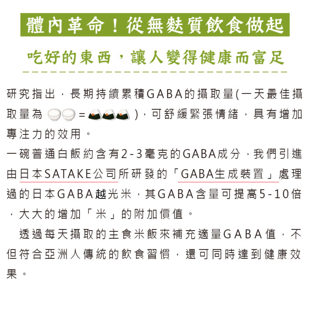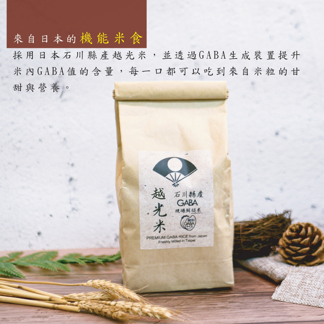 採用日本石川縣所產之越光米,透過GABA生成裝置提升GABA值的含量,採接單現碾的方式出貨,避免水分流失,確保新鮮,每一口都可以吃到來自米穀的甘甜與營養。