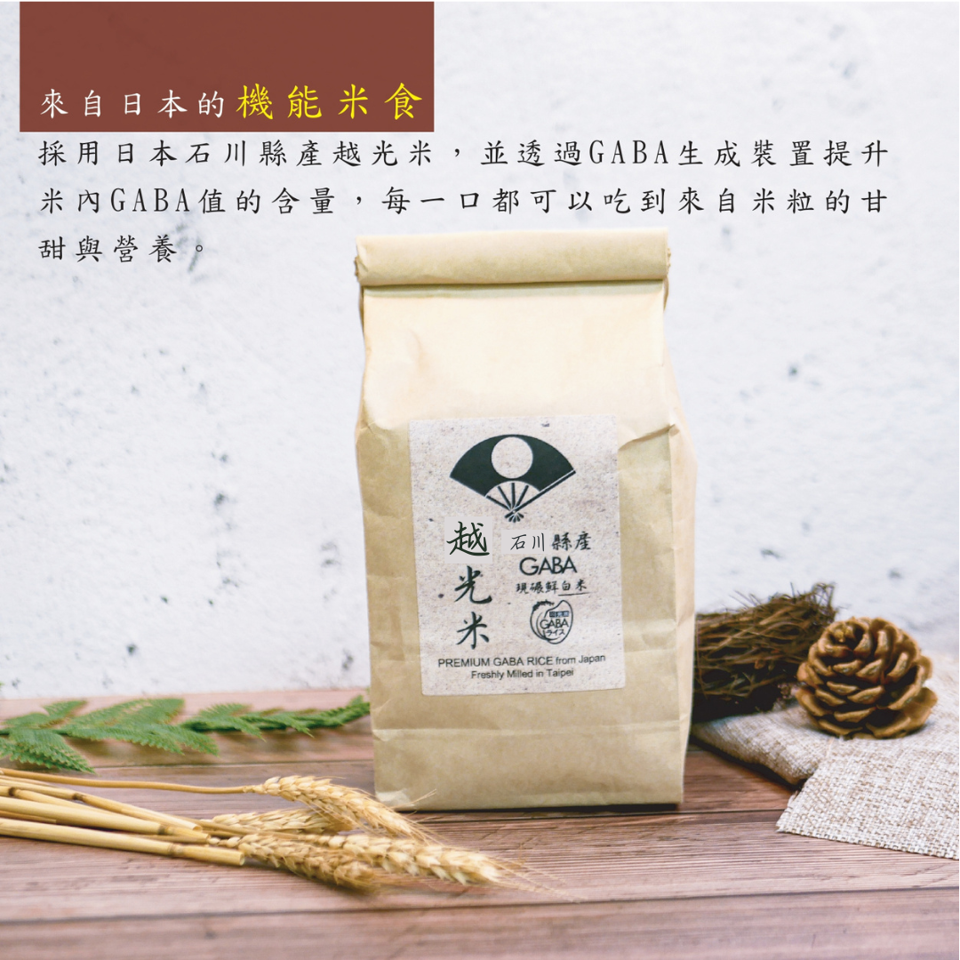 採用日本石川縣所產之越光米,透過GABA生成裝置提升GABA值的含量,採接單現碾的方式出貨,避免水分流失,確保新鮮,每一口都可以吃到來自米穀的甘甜與營養。
